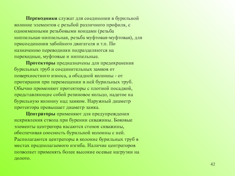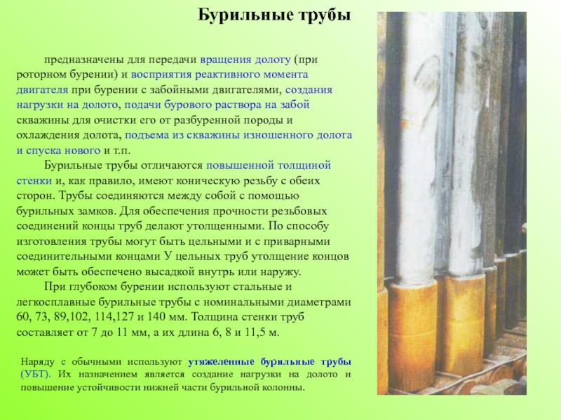 Наряду с обычными используют утяжеленные бурильные трубы (УБТ). Их назначением является создание нагрузки на долото и повышение устойчивости нижней части бурильной колонны.