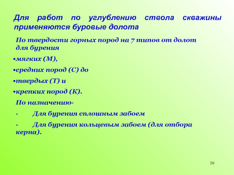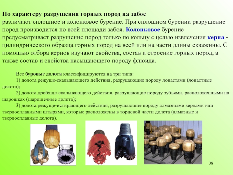 3) долота режуще-истирающего действия, разрушающие породу алмазными зернами или твердосплавными штырями, которые расположены в торцевой части долота (алмазные и твердосплавные долота).
