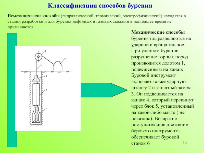 При ударном бурении разрушение горных пород производится долотом 1, подвешенным на канате Буровой инструмент включает также ударную штангу 2 и канатный замок 3. Он подвешивается на канате 4, который перекинут через блок 5, установленный на какой-либо мачте ( не показана). Возвратно-поступательное движение бурового инструмента обеспечивает буровой станок 6