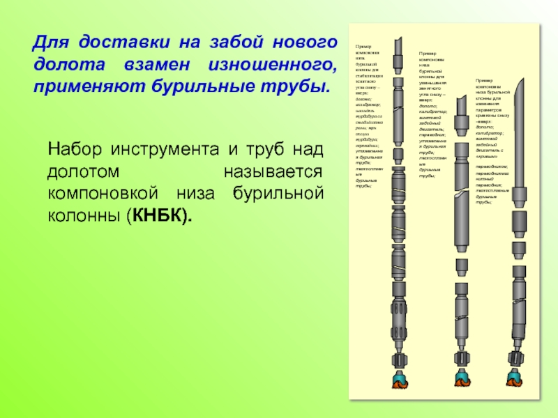 Набор инструмента и труб над долотом называется компоновкой низа бурильной колонны (КНБК).