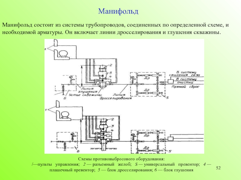 /—пульты управления; 2 — разъемный желоб; S — универсальный превентор; 4 — плашечный превентор; 5 — блок дросселирования; 6 — блок глушения