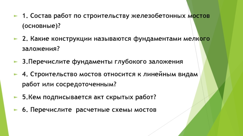 Слайд 431. Состав работ по строительству железобетонных мостов (основные)?