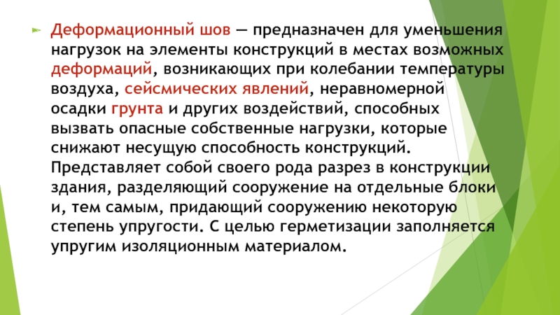 возможных деформаций, возникающих при колебании температуры воздуха, сейсмических явлений, неравномерной осадки грунта и других воздействий, способных вызвать опасные собственные нагрузки, которые снижают несущую способность конструкций. Представляет собой своего рода разрез в конструкции здания, разделяющий сооружение на отдельные блоки и, тем самым, придающий сооружению некоторую степень упругости. С целью герметизации заполняется упругим изоляционным материалом.