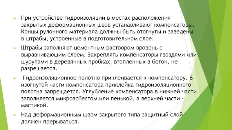 Слайд 52При устройстве гидроизоляции в местах расположения закрытых деформационных швов устанавливают компенсаторы.