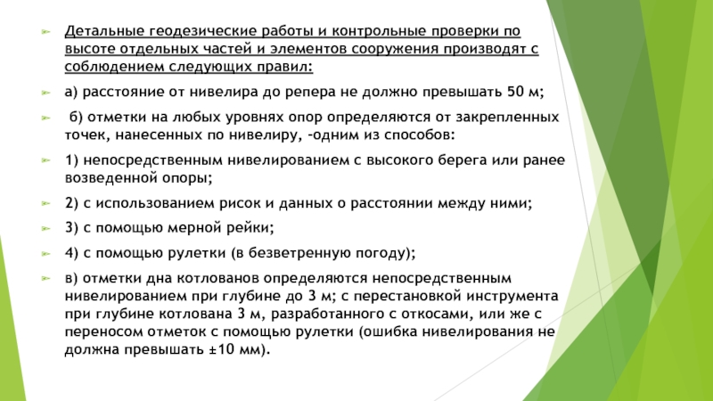 Слайд 13Детальные геодезические работы и контрольные проверки по высоте отдельных частей и