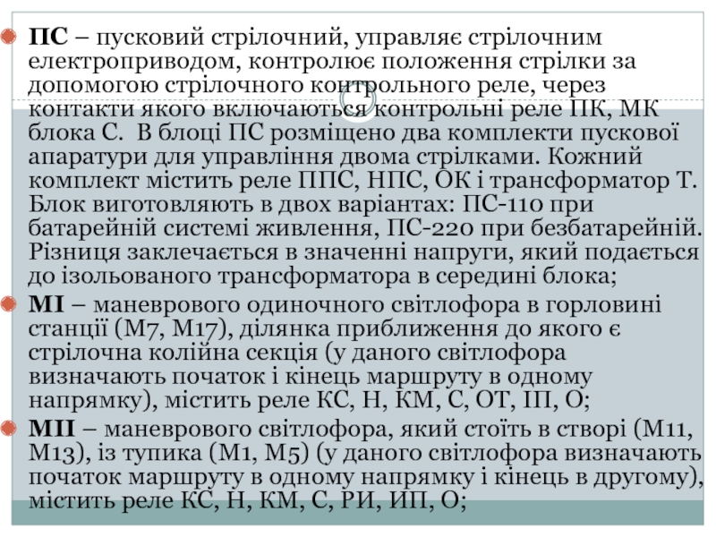 Слайд 12ПС – пусковий стрілочний, управляє стрілочним електроприводом, контролює положення стрілки за