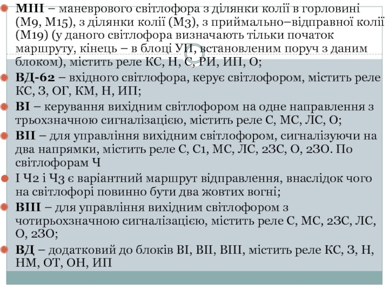 МІІ – маневрового світлофора, який стоїть в створі (М11, М13), із тупика (М1, М5) (у даного світлофора визначають початок маршруту в одному напрямку і кінець в другому), містить реле КС, Н, КМ, С, РИ, ИП, О;