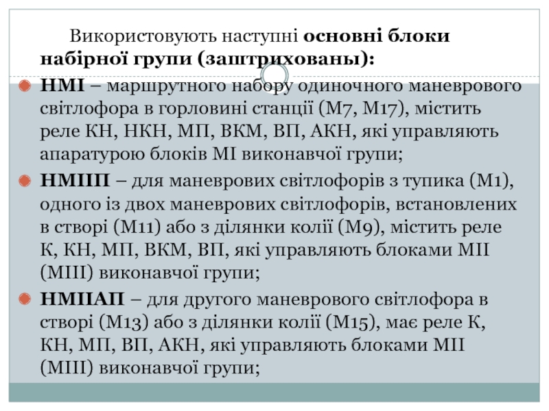 НМІ – маршрутного набору одиночного маневрового світлофора в горловині станції (М7, М17), містить реле КН, НКН, МП, ВКМ, ВП, АКН, які управляють апаратурою блоків МІ виконавчої групи;