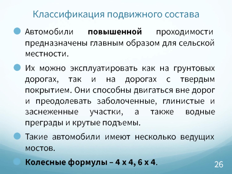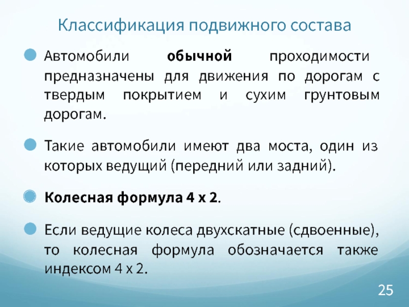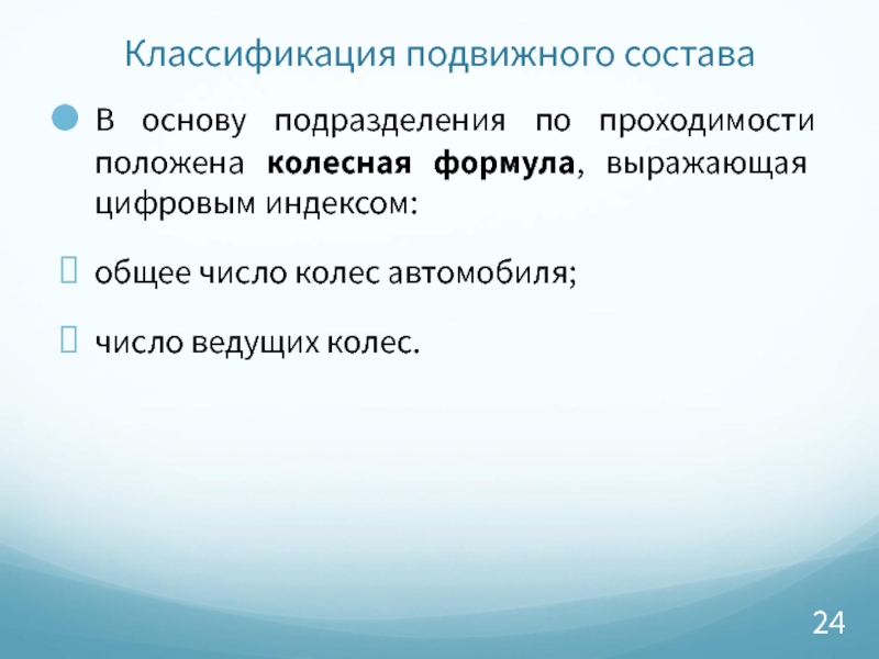 В основу подразделения по проходимости положена колесная формула, выражающая