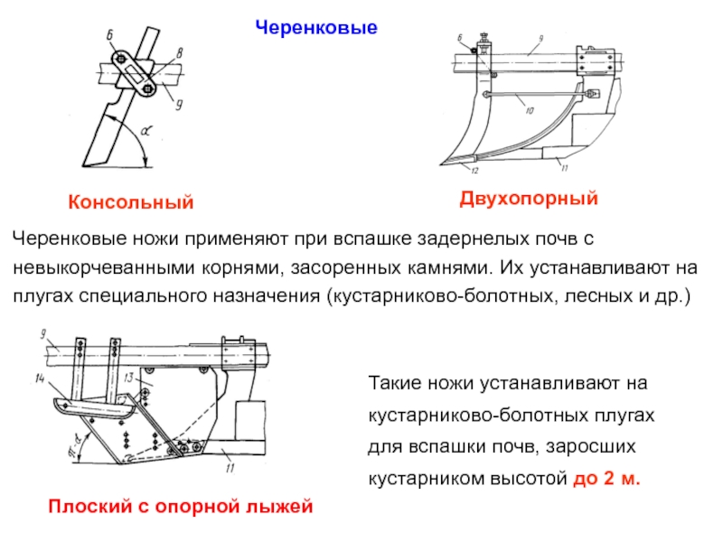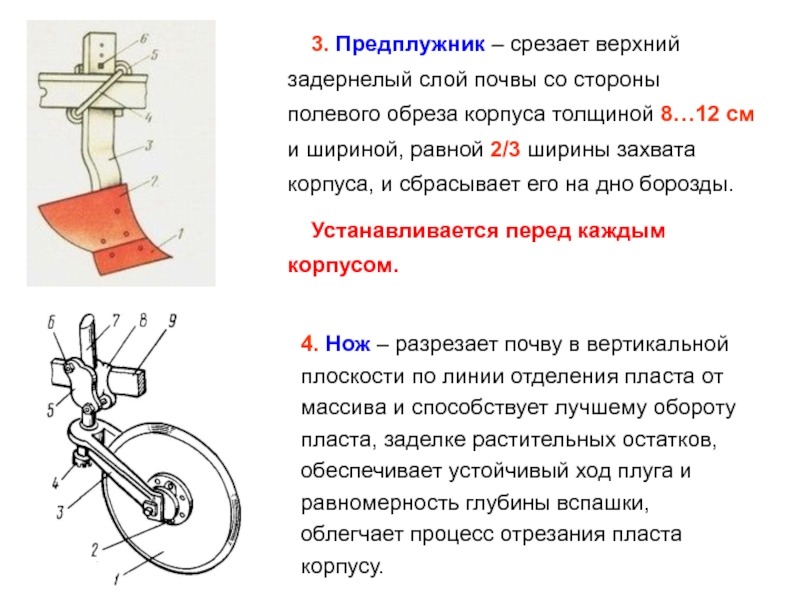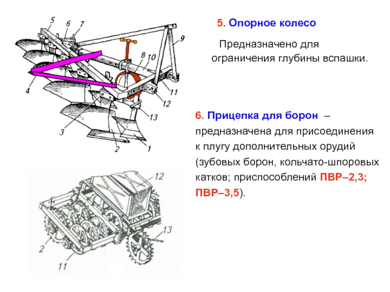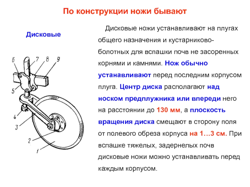 1 – предплужник; 2 – корпус; 3 – угольник; 4 – прицепка для борон; 5 – главная балка; 6 – кронштейн крепления ножа; 7 – дисковый нож; 8 – опорное колесо; 9 – навеска; 10 – продольная балка; 11 – поперечная балка; 12 – кронштейн; 13 – кронштейн предплужника.