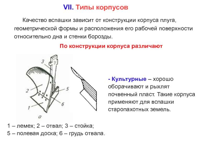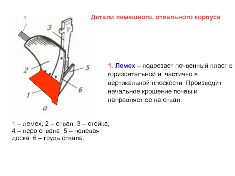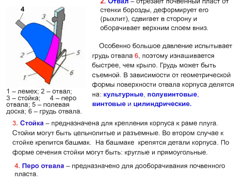 1 – лемех; 2 – отвал; 3 – стойка; 4 – перо отвала; 5 – полевая доска; 6 – грудь отвала.