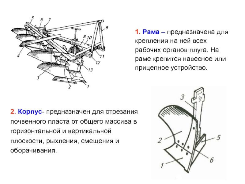 2. Корпус- предназначен для отрезания почвенного пласта от общего массива в горизонтальной и вертикальной плоскости, рыхления, смещения и оборачивания.
