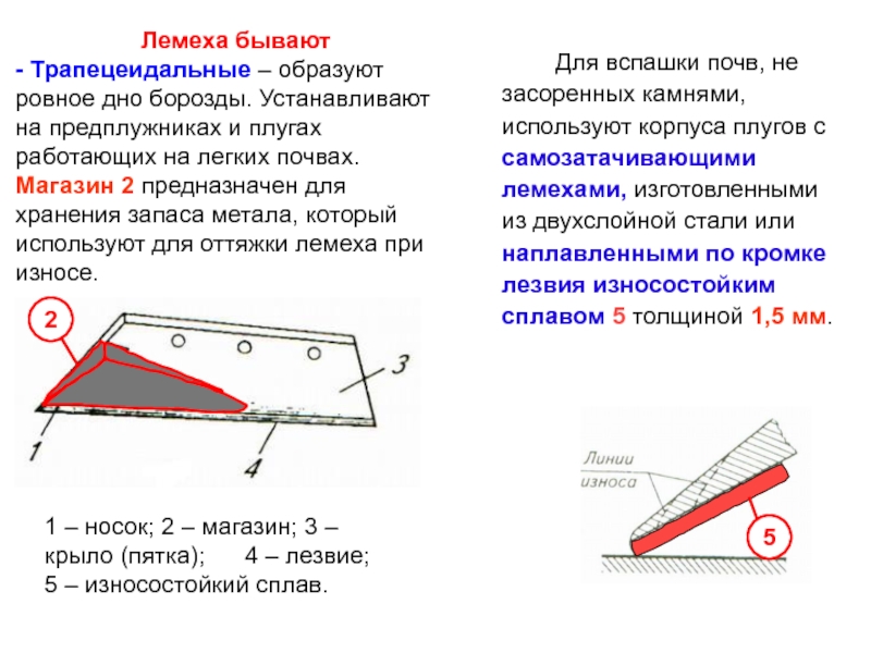 1 – носок; 2 – магазин; 3 – крыло (пятка); 4 – лезвие; 5 – износостойкий сплав.