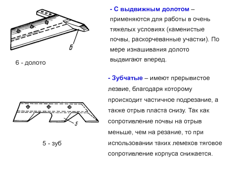 Особенно большое давление испытывает грудь отвала 6, поэтому изнашивается быстрее, чем крыло. Грудь может быть съемной. В зависимости от геометрической формы поверхности отвала корпуса делятся на: культурные, полувинтовые, винтовые и цилиндрические.