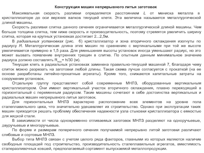 В радиальных установках (рис. б) кристаллизатор и зона вторичного охлаждения изогнуты по радиусу R. Металлургическая длина этих машин по сравнению с вертикальными при той же высоте увеличивается примерно в 1,5 раза. Для уменьшения высоты установок иногда уменьшают радиус, но это может вызвать появление внутренних трещин в слитке. По опытным данным минимальное значение радиуса должно составлять Rmin= h/30 (м).