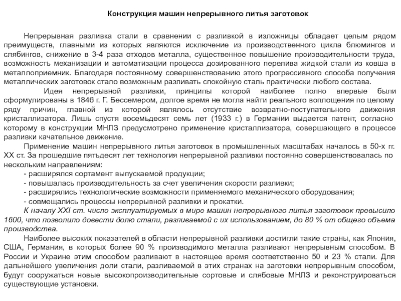 Скорость разливки слитка данного сечения ограничивается металлургической длиной машины. Чем больше толщина слитка, тем ниже скорость и производительность, поэтому стремятся увеличить ширину слитка, которая на крупных установках достигает 2...2,5м.