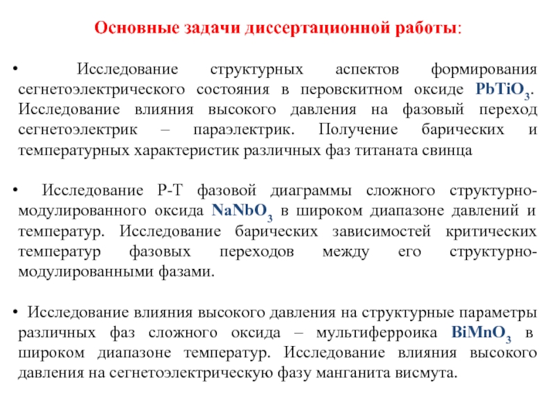 температуры на кристаллическую структуру перовскитовых сегнетоэлектриков PbTiO3, NaNbO3 и BiMnO3, определение структурных механизмов формирования их сегнетоэлектрических свойств и построение фазовых диаграмм этих соединений в широком диапазоне давлений и температур.