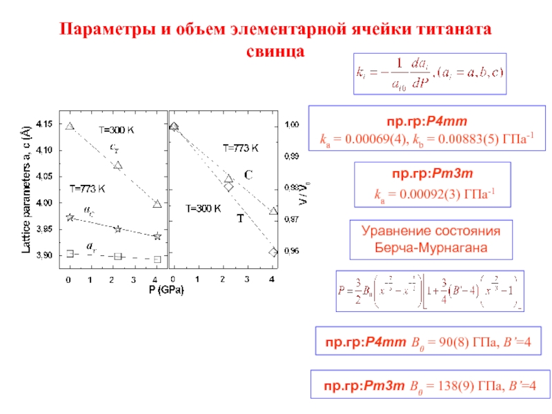 в PbTiO3. Получены барические и температурные коэффиценты тетрагональной и кубической фазы PbTiO3.