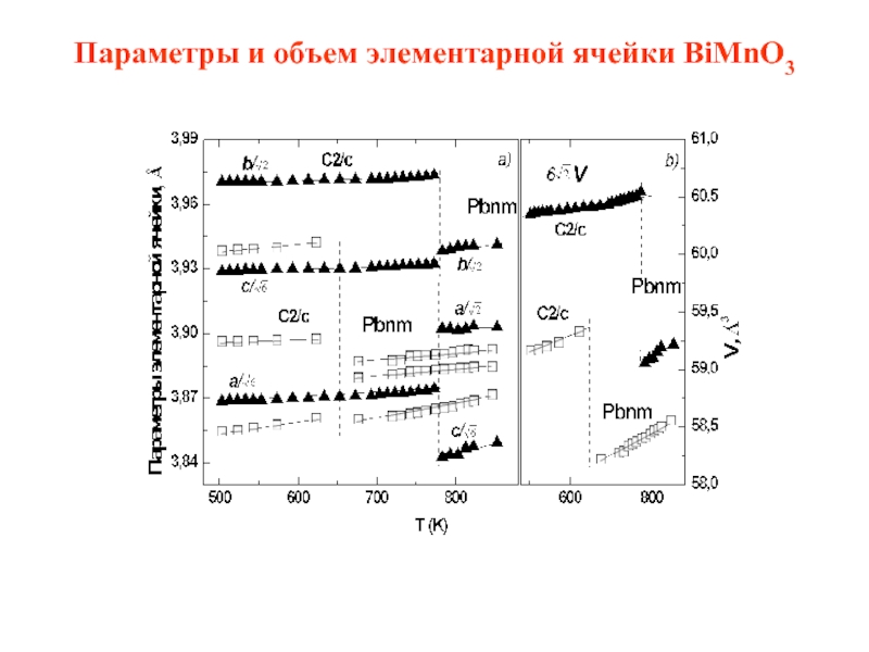 Слайд 24Параметры и объем элементарной ячейки BiMnO3