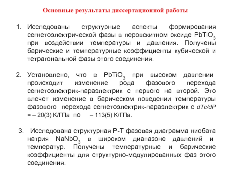 3. Исследована структурная P-T фазовая диаграмма ниобата натрия NaNbO3 в широком диапазоне давлений и температур. Получены температурные и барические коэффициенты для структурно-модулированных фаз этого соединения.