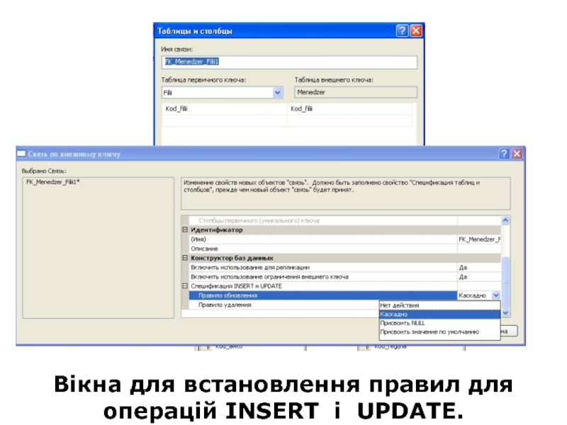 Слайд 25Вікна для встановлення правил для операцій INSERT і UPDATE.