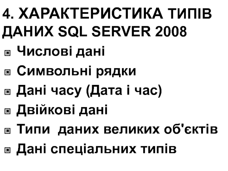 Слайд 264. ХАРАКТЕРИСТИКА ТИПІВ ДАНИХ SQL SERVER 2008