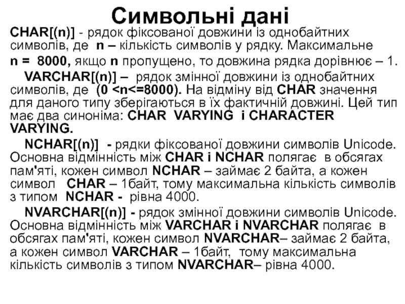 VARCHAR[(n)] – рядок змінної довжини із однобайтних символів, де (0 NCHAR[(n)] - рядки фіксованої довжини символів Unicode. Основна відмінність між CHAR і NCHAR полягає в обсягах пам'яті, кожен символ NCHAR – займає 2 байта, а кожен символ CHAR – 1байт, тому максимальна кількість символів з типом NCHAR - рівна 4000.