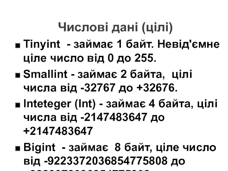 Слайд 27Tinyint - займає 1 байт. Невід'ємне ціле число від 0 до