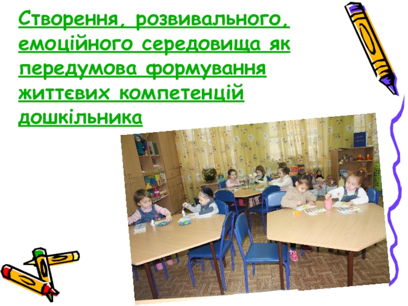Слайд 12Створення, розвивального, емоційного середовища як передумова формування життєвих компетенцій дошкільника