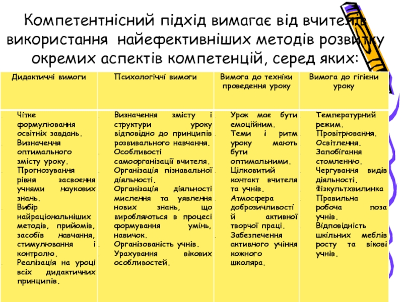 Слайд 23Компетентнісний підхід вимагає від вчителів використання найефективніших методів розвитку окремих аспектів