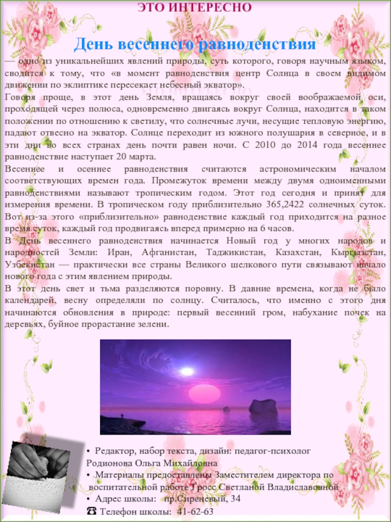 — одно из уникальнейших явлений природы, суть которого, говоря научным языком, сводится к тому, что «в момент равноденствия центр Солнца в своем видимом движении по эклиптике пересекает небесный экватор».