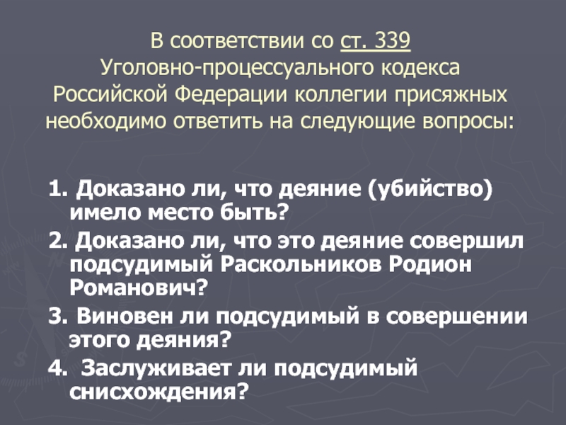 2. Доказано ли, что это деяние совершил подсудимый Раскольников Родион Романович?