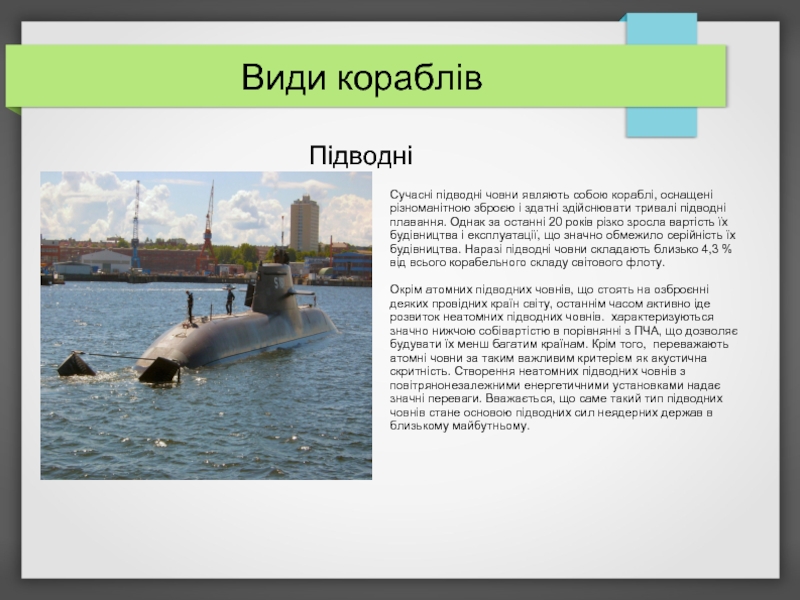 Сучасні підводні човни являють собою кораблі, оснащені різноманітною зброєю і здатні здійснювати тривалі підводні плавання. Однак за останні 20 років різко зросла вартість їх будівництва і експлуатації, що значно обмежило серійність їх будівництва. Наразі підводні човни складають близько 4,3 % від всього корабельного складу світового флоту.