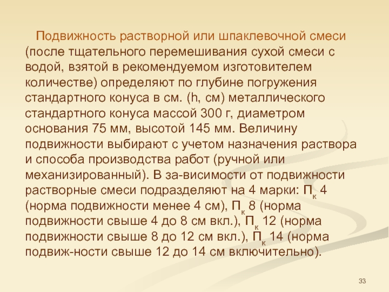 растворы для обрызга, применяемые в помещениях с нормальным влажностным режимом, а также для наружных и внутренних штукатурок, подверженных воздействию влаги. При этом подвижность раствора, измеренная стандартным конусом, должна быть при механизированном нанесении 80...100 мм, при ручном - 110...130 мм.
