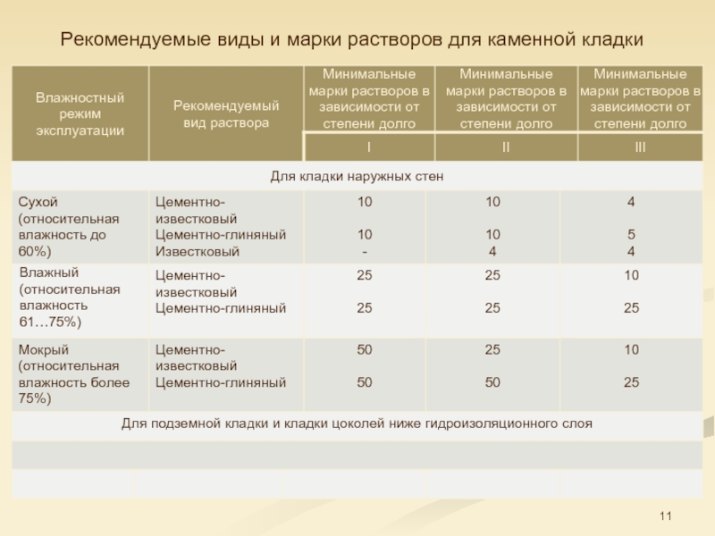 Слайд 11Рекомендуемые виды и марки растворов для каменной кладки