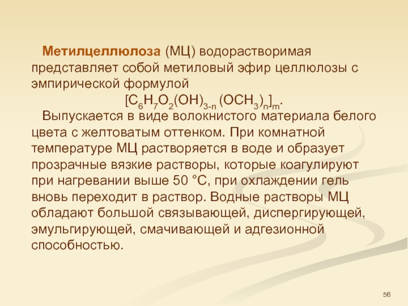 Слайд 56 Метилцеллюлоза (МЦ) водорастворимая представляет собой метиловый эфир целлюлозы с