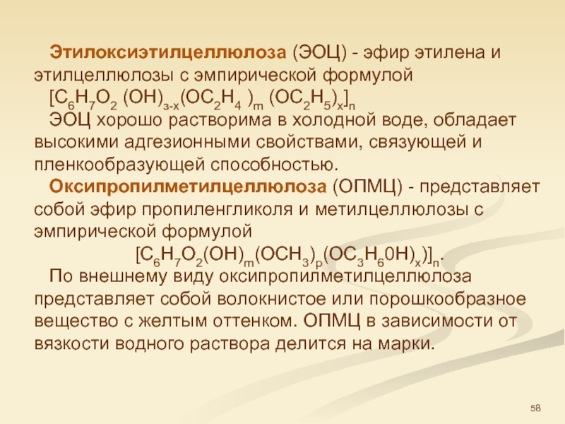 Слайд 58 Этилоксиэтилцеллюлоза (ЭОЦ) - эфир этилена и этилцеллюлозы с эмпирической