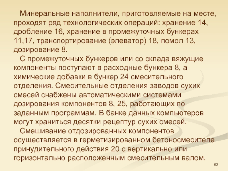 Слайд 63 Минеральные наполнители, приготовляемые на месте, проходят ряд технологических операций: