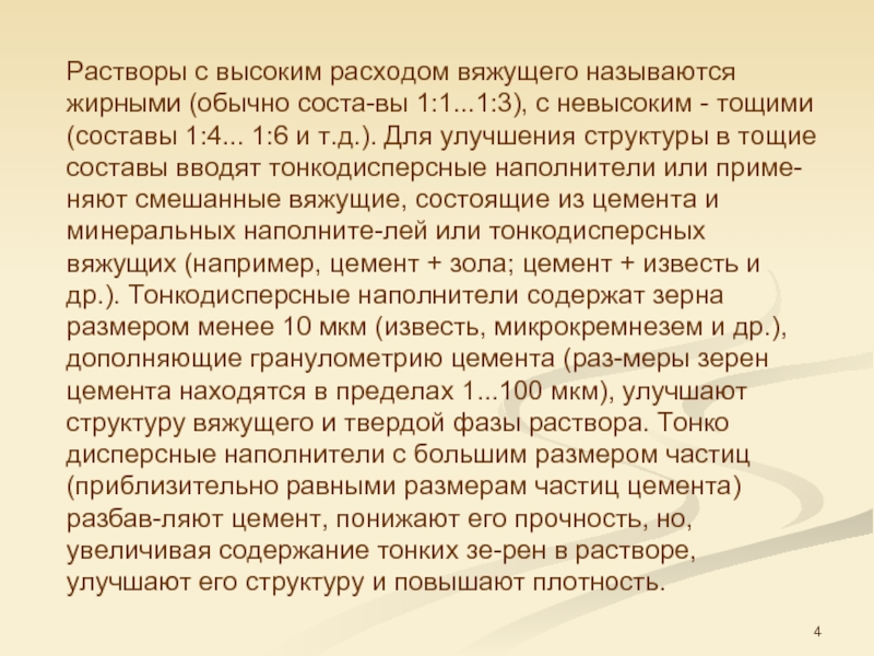 невысоким - тощими (составы 1:4... 1:6 и т.д.). Для улучшения структуры в тощие составы вводят тонкодисперсные наполнители или применяют смешанные вяжущие, состоящие из цемента и минеральных наполнителей или тонкодисперсных вяжущих (например, цемент + зола; цемент + известь и др.). Тонкодисперсные наполнители содержат зерна размером менее 10 мкм (известь, микрокремнезем и др.), дополняющие гранулометрию цемента (размеры зерен цемента находятся в пределах 1...100 мкм), улучшают структуру вяжущего и твердой фазы раствора. Тонко дисперсные наполнители с большим размером частиц (приблизительно равными размерам частиц цемента) разбавляют цемент, понижают его прочность, но, увеличивая содержание тонких зерен в растворе, улучшают его структуру и повышают плотность.