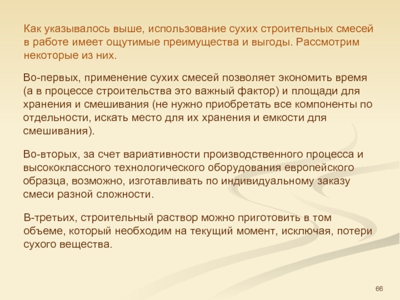 Слайд 66Во-первых, применение сухих смесей позволяет экономить время (а в процессе строительства