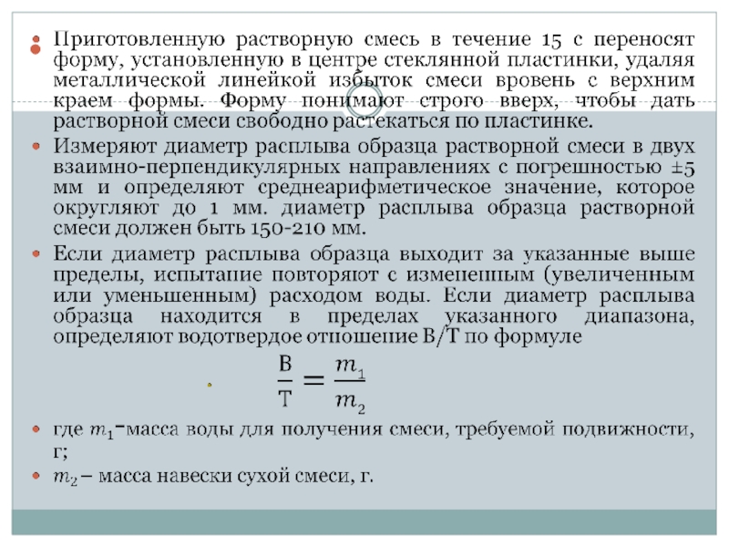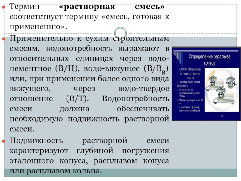 строительным смесям, водопотребность выражают в относительных единицах через водо-цементное (В/Ц), водо-вяжущее (В/ВВ) или, при применении более одного вида вяжущего, через водо-твердое отношение (В/Т). Водопотребность смеси должна обеспечивать необходимую подвижность растворной смеси.