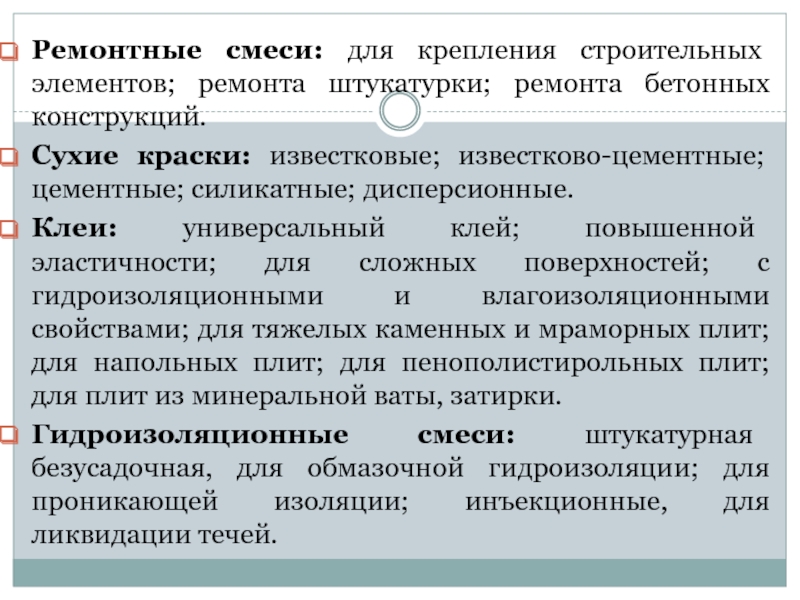Ремонтные смеси: для крепления строительных элементов; ремонта штукатурки; ремонта бетонных конструкций.
