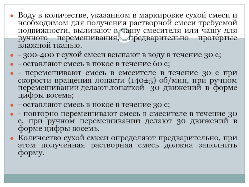 Воду в количестве, указанном в маркировке сухой смеси и необходимом для получения растворной смеси требуемой подвижности, выливают в чашу смесителя или чашу для ручного перемешивания, предварительно протертые влажной тканью.