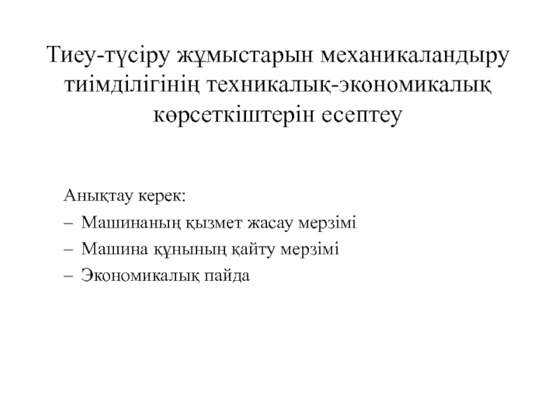 Слайд 9Тиеу-түсіру жұмыстарын механикаландыру тиімділігінің техникалық-экономикалық көрсеткіштерін есептеу
