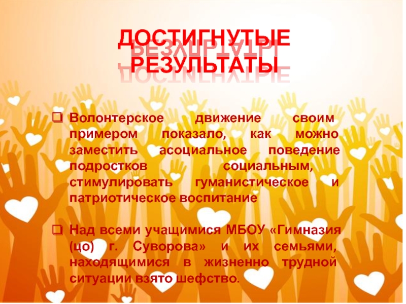 На самом деле волонтерство существует очень давно. И приятно осознавать то, что среди современной молодежи, желающих стать волонтерами, становится все больше и больше. Вот и в нашей гимназии нашлись такие ребята, которые добровольно решили вступить в наши ряды. Ведь всегда рядом найдется тот, кому необходима помощь и поддержка. В нашем городе тоже есть такие. А у ребят из отряда есть желание протянуть руку помощи. Мы будем стремиться ТВОРИТЬ ДОБРО!