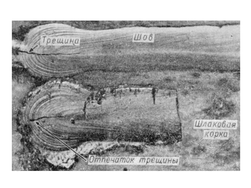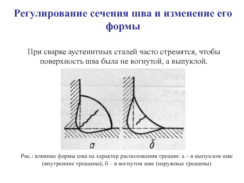 Рис.: влияние формы шва на характер расположения трещин: а – в выпуклом шве (внутренние трещины); б – в вогнутом шве (наружные трещины)