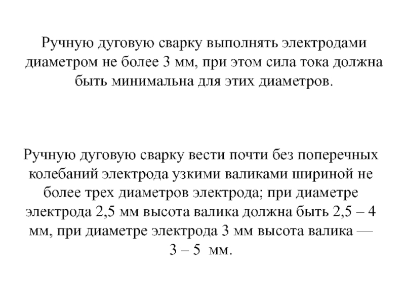 Ручную дуговую сварку вести почти без поперечных колебаний электрода узкими валиками шириной не более трех диаметров электрода; при диаметре электрода 2,5 мм высота валика должна быть 2,5 – 4 мм, при диаметре электрода 3 мм высота валика — 3 – 5 мм.