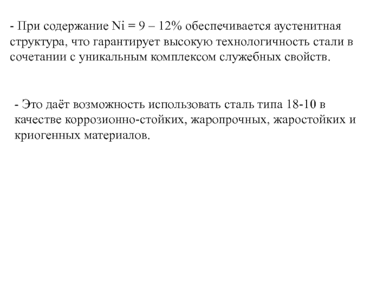 Слайд 10- При содержание Ni = 9 – 12% обеспечивается аустенитная структура,