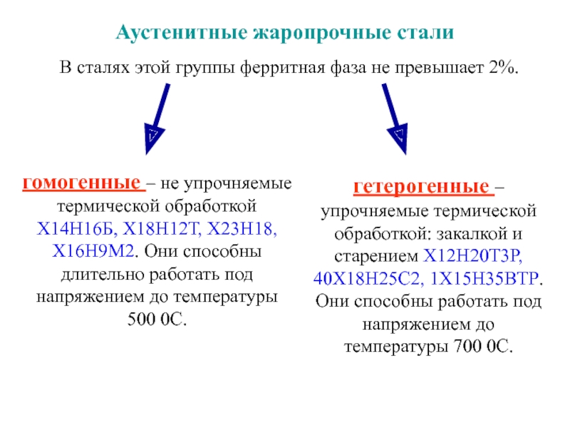 гомогенные – не упрочняемые термической обработкой Х14Н16Б, Х18Н12Т, Х23Н18, Х16Н9М2. Они способны длительно работать под напряжением до температуры 500 0С.