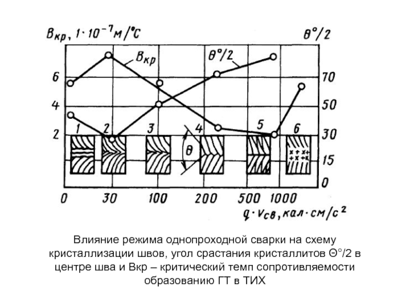 Слайд 44Влияние режима однопроходной сварки на схему кристаллизации швов, угол срастания кристаллитов